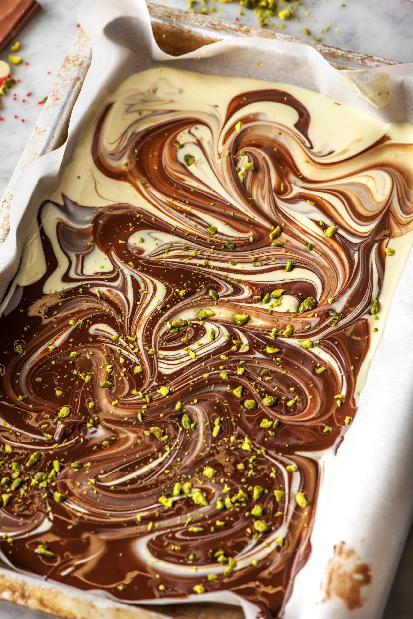 - Giet de gesmolten chocolade over een met bakpapier bedekte bakplaat.